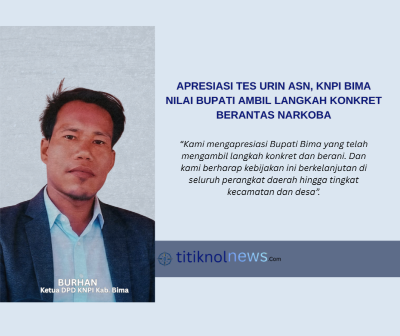 Kabupaten Bima, Titiknolnews.com — Komite Nasional Pemuda Indonesia (KNPI) Kabupaten Bima mengapresiasi langkah Pemerintah Daerah (Pemda) Bima yang menggelar tes urin bagi aparatur sipil negara (ASN) dan tenaga honorer. Kebijakan tersebut dinilai sebagai langkah konkret Bupati Bima Ady Mahyudi dalam upaya pencegahan dan deteksi dini penyalahgunaan narkoba di lingkungan pemerintahan.